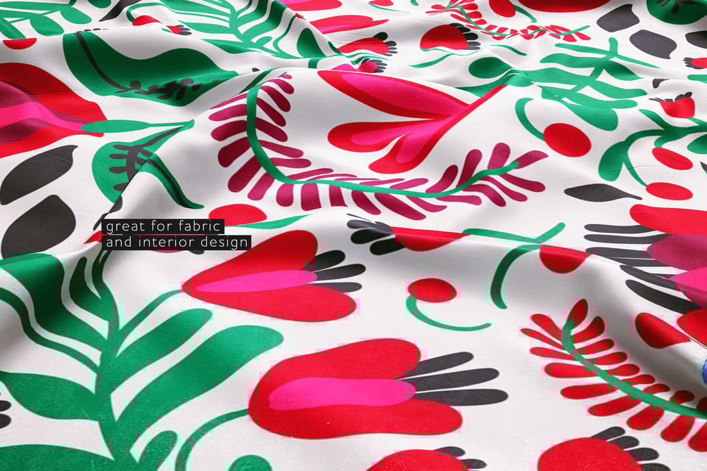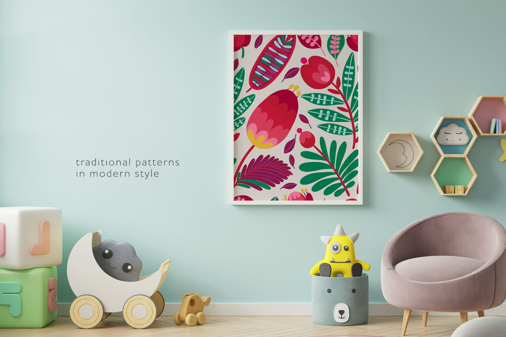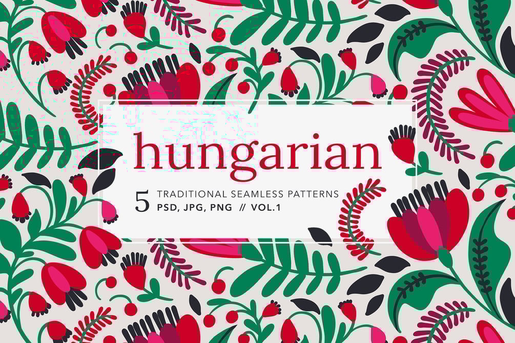 Inspired by traditional embroidery, fabrics and national costumes from Hungary. These are stylised florals and bold Hungarian patterns clash in bright colour combos for the vibrant story. Patterns are perfect for fabric design, branding, packaging and product design.