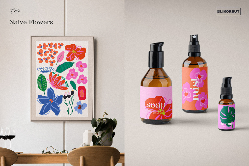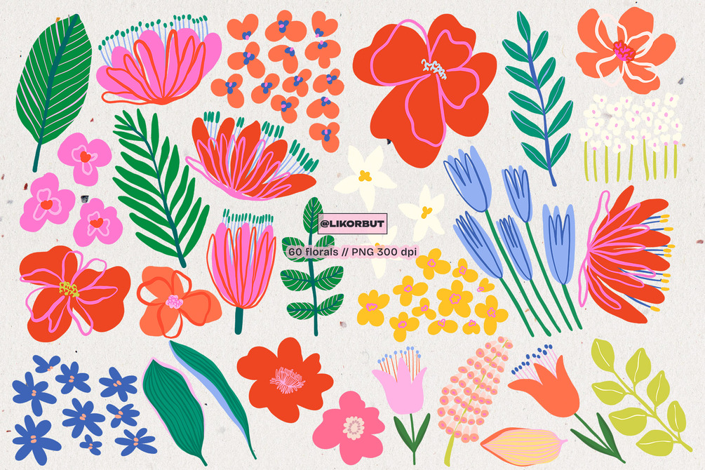 Bring the flower market to your designs! This collection bursts with 60 unique naive flower motifs, each hand-drawn with imperfect charm. The abstract blooms dance in vibrant hues, capturing the carefree spirit of a flower market. Our naive abstract blooms collection brings hand-drawn charm to any project. Includes 6 ready-to-print card designs. Perfect for adding organic warmth to packaging, textiles, or stationery. Files delivered as high-res PNGs with transparent backgrounds.