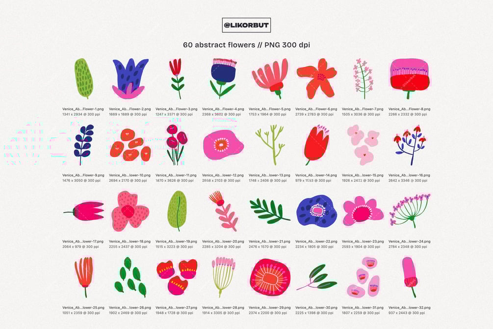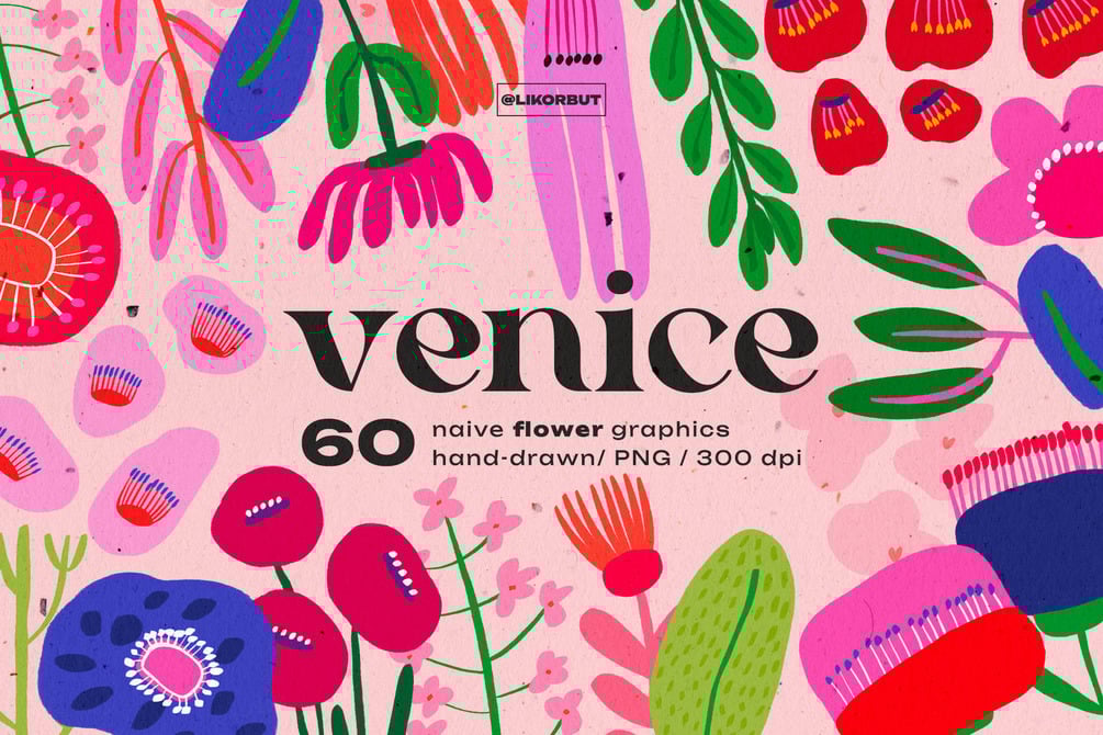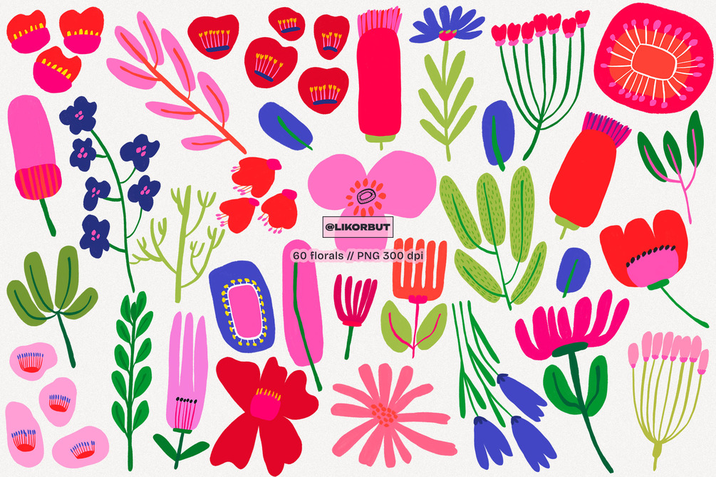 Vibrant and bright, whimsical colors and naive collection for your project. The pack consists flowers and leaves can be used individually or combined with other elements. Also set includes 6 ready-to-use cards. Create your own individual composition using all these bright elements or choose one of the element and create a beautiful logo or postcard. Graphics are perfect for fabric design, branding, packaging and product design.